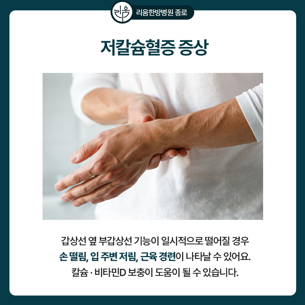 갑상선 옆에 붙어 있는 부갑상선이 수술 과정에서 일시적으로 기능이 떨어지면 혈중 칼슘 농도가 낮아져 손 저림, 입 주변 감각 이상, 근육 경련 등의 증상이 나타날 수 있습니다. 대부분 시간이 지나면서 부갑상선 기능이 회복되며, 이 기간 동안은 칼슘과 비타민D 보충을 통해 안정적으로 관리할 수 있습니다.