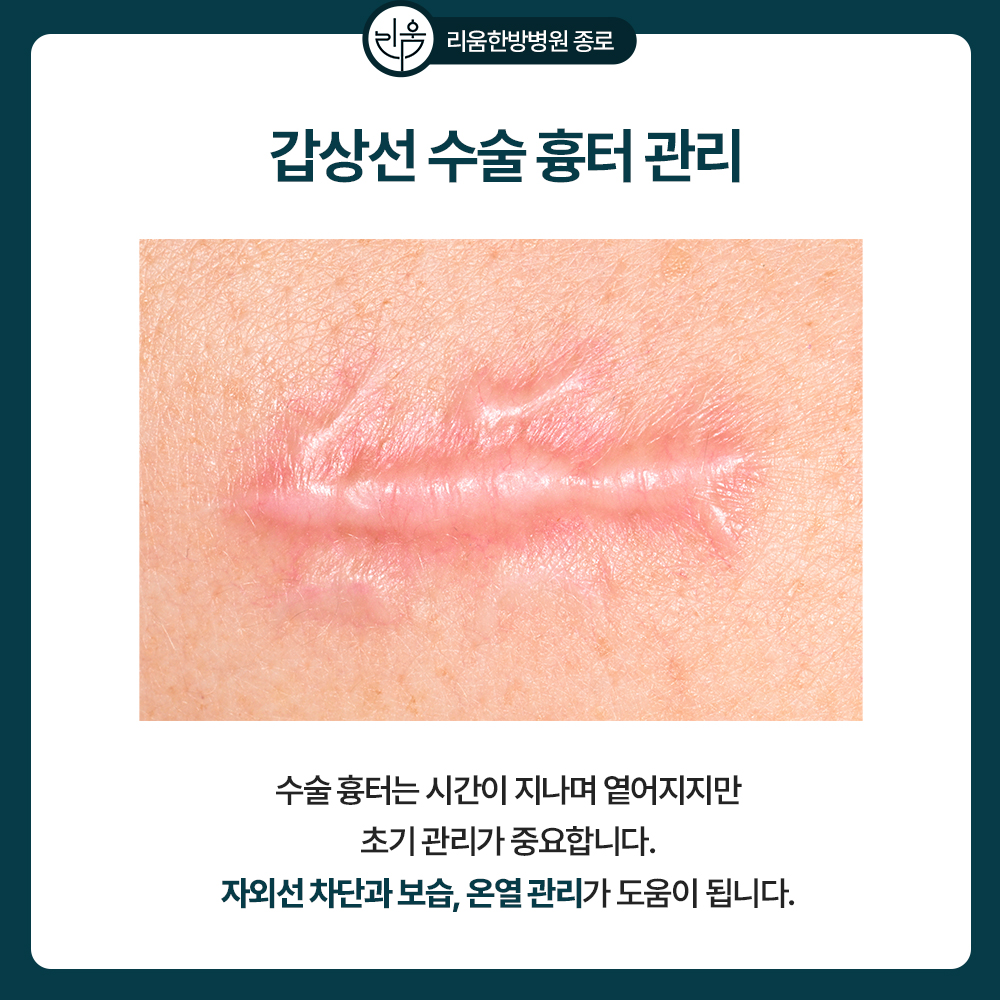 수술 흉터에 대해서도 많은 분들이 걱정하시는데, 초기에는 붉고 단단해 보일 수 있으나 시간이 지나면서 점차 옅어지고 부드러워집니다. 자외선 차단, 보습, 온열 관리 등 꾸준한 관리가 흉터 완화에 도움을 줍니다.