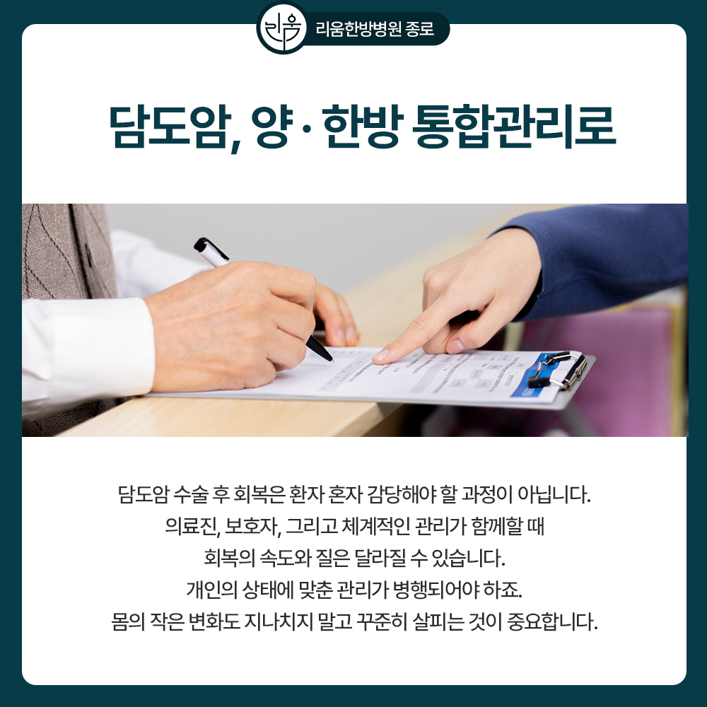 오히려 수술 이후의 회복과 관리가 예후와 삶의 질을 좌우하는 또 하나의 치료 과정이라 할 수 있습니다.