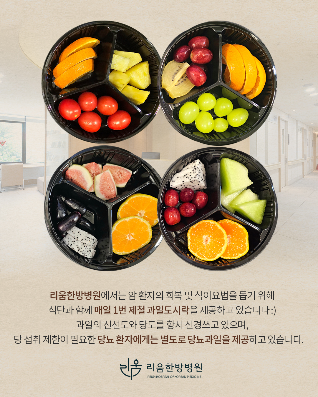 리움한방병원에서는 암 환자의 회복 및 식이요법을 돕기 위해 식단과 함께 매일 1번 제철 과일도시락을 제공하고 있습니다 :)